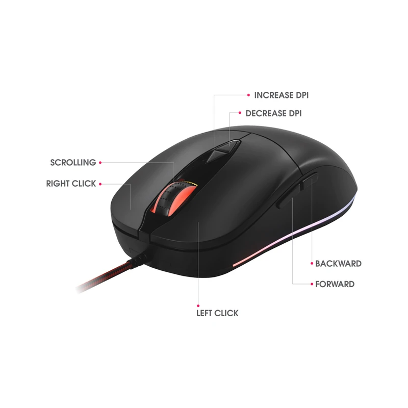 ماوس TM 766 GA با ابعاد 115×63×29 میلیمتر و وزن 110 گرم طراحی شده است که در کنار طراحی ارگونومیک، استفاده از این موس را حتی در ساعات طولانی بدون خستگی فراهم میسازد. جنس بدنه از پلاستیک ABS با کیفیت ساخته شده که نه تنها مقاومت بالایی در برابر ضربه و خراشیدگی دارد، بلکه به دلیل طراحی شیک و رنگ مشکی جذاب، ظاهری حرفهای و مدرن به میز کار شما میبخشد. ماوس TM 766 GA با استفاده از کانکتور USB A به دستگاههای مختلف متصل میشود. طول کابل 1.8 متری این موس، که از جنس پنبه بافتهشده ساخته شده است، انعطافپذیری و دوام بالایی را به همراه دارد. این طول کابل نه تنها فضای کاری بیشتری را در اختیار کاربر قرار میدهد، بلکه از گره خوردن و آسیب به کابل جلوگیری میکند یکی از مهمترین قابلیتهای موس TM 766 GA، امکان تنظیم DPI است. این ماوس به طور پیشفرض دارای 1200 DPI است اما با فشردن کلید تنظیم DPI، کاربر میتواند دقت موس را به 2400، 4800 و حتی 7200 DPI تغییر دهد. این ویژگی بهخصوص برای گیمرها و کاربران حرفهای که نیاز به دقت و سرعت بالاتری دارند، بسیار کارآمد است. ماوس TM 766 GA به 7 کلید مجزا مجهز است که دو کلید آن در کنار موس تعبیه شدهاند و برای اجرای دستورات مختلف به کار میروند. این کلیدها با قابلیت تحمل 3 میلیون بار کلیک، تضمینی بر طول عمر و کارایی بلندمدت این محصول هستند. طراحی هوشمندانه و جایگذاری مناسب این کلیدها، تجربه کاری را به مراتب راحتتر و سریعتر میکند. نورپردازی LED در ماوس TM 766 GA نه تنها به زیبایی ظاهری آن افزوده، بلکه به عنوان یک نشانه بصری در محیطهای کمنور نیز عمل میکند. این نورپردازی در حین کار، جلوهای خاص به موس میدهد و میتواند تجربه کاربری را به سطح جدیدی ارتقاء دهد.