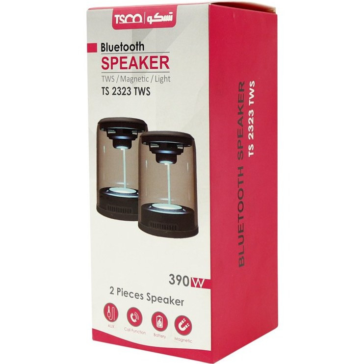 اسپیکر بلوتوثی TS 2323 TWS از TSCO در طراحی خاص ساخته شده است به صورتی که با قابلیت جداسازی امکان استفاده به عنوان اسپیکر دو تکه را خواهد داشت و با وجود آهنربا در قسمت زیرین هر تکه، بلندگوها مجددا به یکدیگر متصل می شوند و به عنوان یک دستگاه پخش کننده صوتی واحد قابل استفاده می باشند. اتصال این اسپیکر از طریق بلوتوث نسخه ۵٫۰ به صورت بی سیم تا شعاع ۱۰ متری با دستگاه های مختلف نظیر گوشی موبایل، تبلت و … برقرار می شود. جک صوتی ۳٫۵ میلی متری نیز بر روی بدنه آن تعبیه شده تا امکان اتصال باسیم به دستگاه های فاقد بلوتوث نیز برای کاربر وجود داشته باشد. بدنه اسپیکر بلوتوثی تسکو از متریال مرغوب و شفاف در ساخت بهره برده که با پشتیبانی از نورپردازی RGB، زیبایی آن هنگام گوش دادن به موسیقی به ویژه در محیط های تاریک دو چندان به چشم می آید.